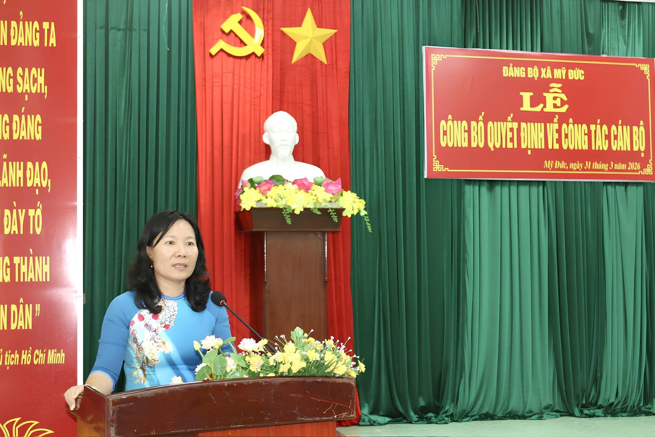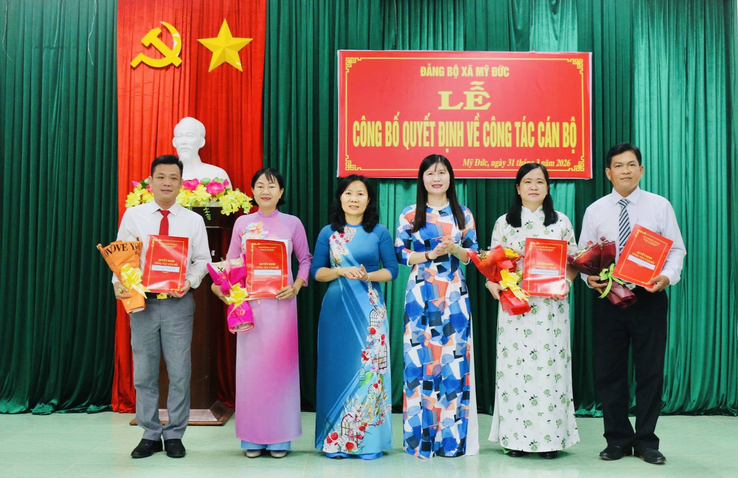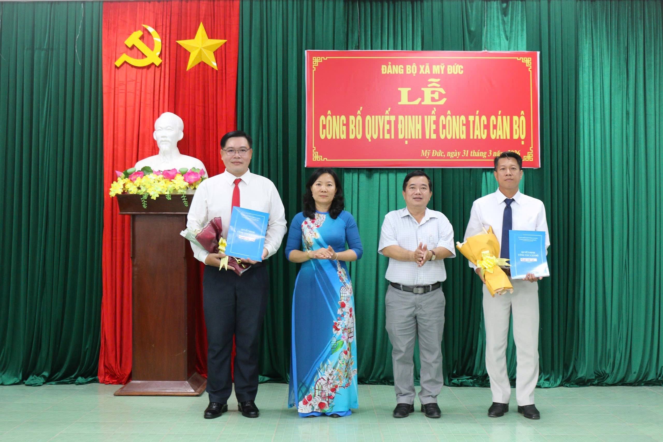 Sáng ngày 31/3/2026, Ban Thường vụ Đảng ủy xã Mỹ Đức long trọng tổ chức Lễ công bố và trao quyết định về công tác cán bộ. Buổi lễ do bà Huỳnh Thị Hằng – Bí thư Đảng ủy, Chủ tịch Hội đồng nhân dân xã chủ trì.
