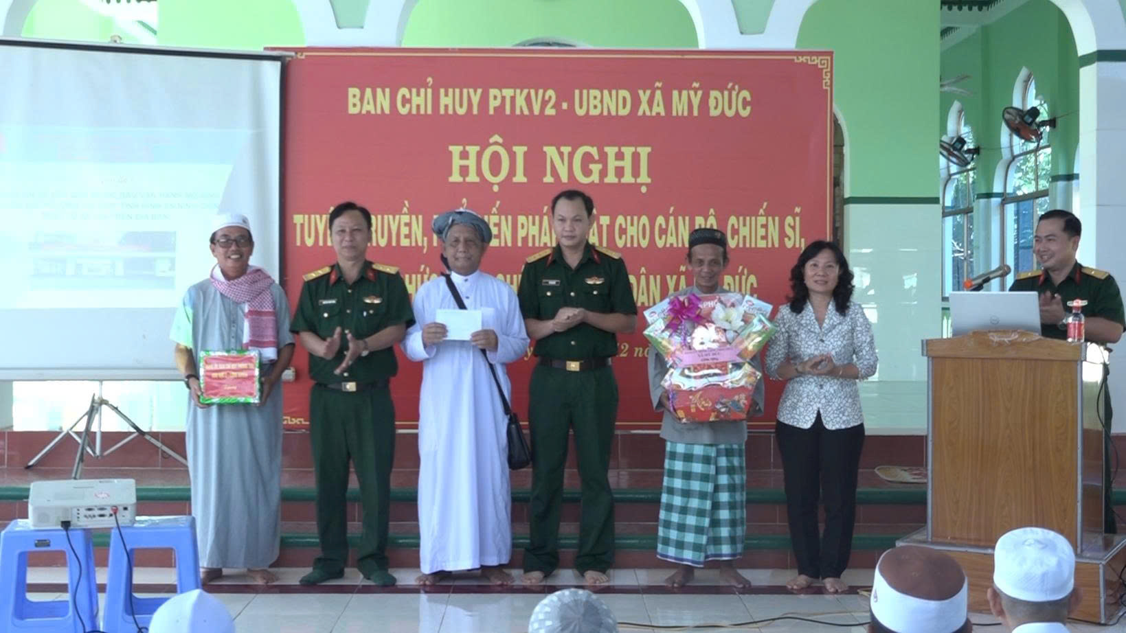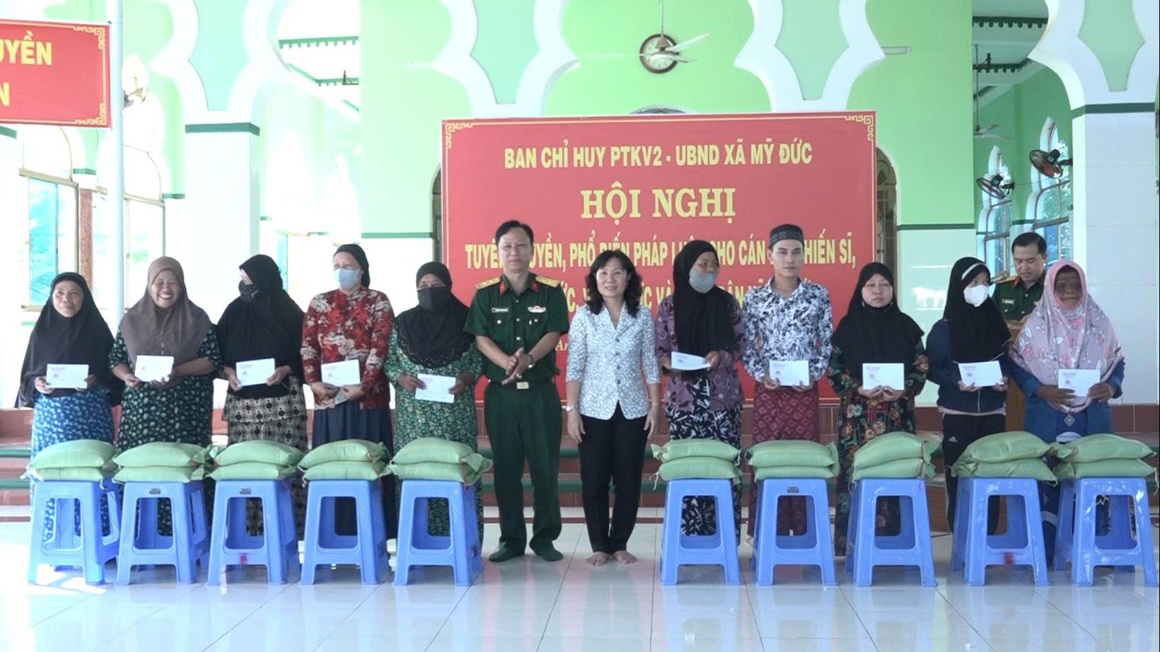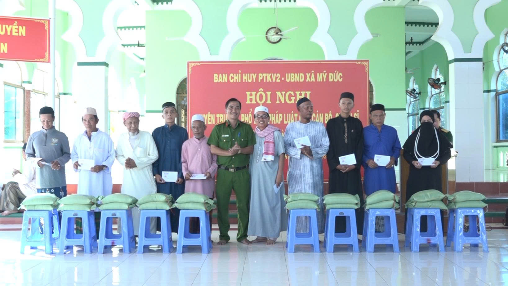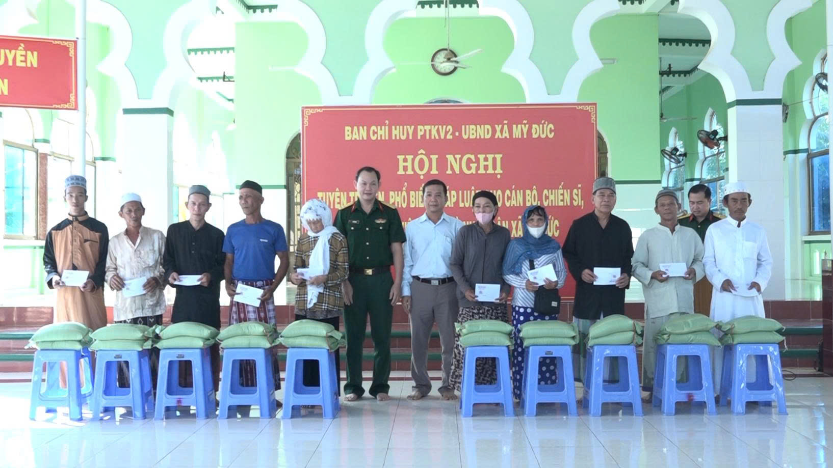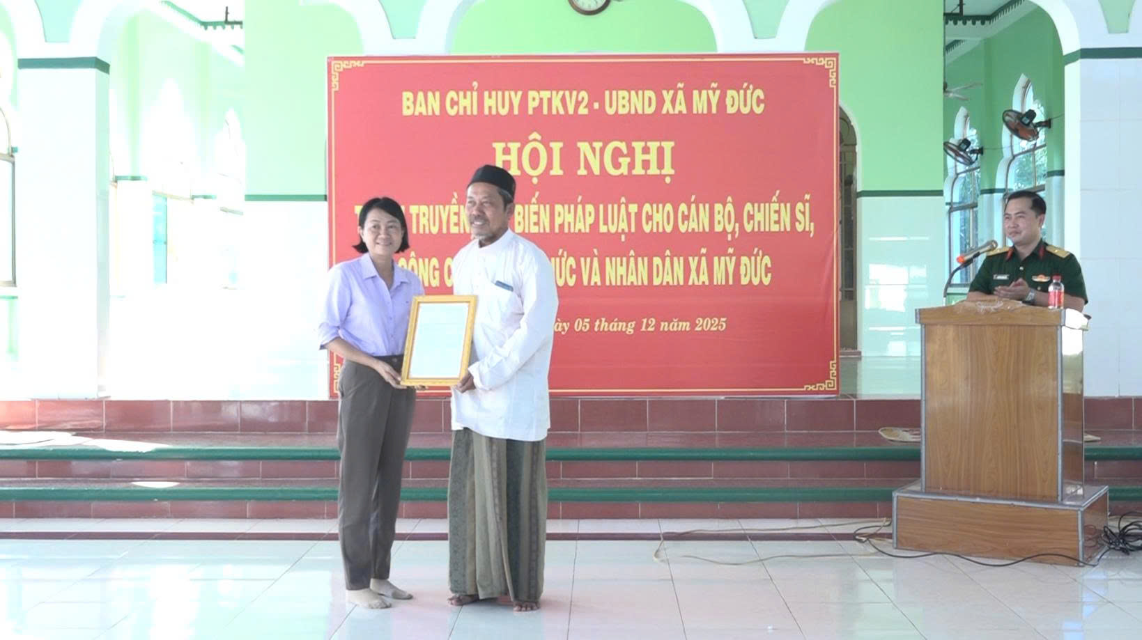 Ngày 05/12/2025, tại Thánh đường Jamiun Aman (ấp Khánh Mỹ), Ủy ban nhân dân xã Mỹ Đức phối hợp với Ban Chỉ huy Phòng thủ khu vực 2 tổ chức Hội nghị tuyên truyền, phổ biến pháp luật cho cán bộ, chiến sĩ, công chức, viên chức và nhân dân trên địa bàn xã. Đến dự hội nghị có đồng chí Huỳnh Thị Hằng – Bí thư Đảng ủy, Chủ tịch Hội đồng nhân dân xã; đồng chí Trung tá Nguyễn Thanh Sang – Phó Chính ủy Ban Chỉ huy Phòng thủ khu vực 2 – Long Xuyên; đồng chí Thượng tá Hồ Văn Giúp – Viện trưởng Viện kiểm sát Quân sự khu vực 92; đồng chí Võ Thị Dung – Ủy viên Ban Thường vụ Đảng ủy, Phó Chủ tịch Ủy ban nhân dân xã; cùng lãnh đạo các phòng chuyên môn, cán bộ, chiến sĩ Công an xã, Ban Chỉ huy Quân sự xã, Ban ấp Khánh Mỹ, Ban Quản trị Thánh đường và đông đảo bà con đồng bào dân tộc Chăm trên địa bàn.