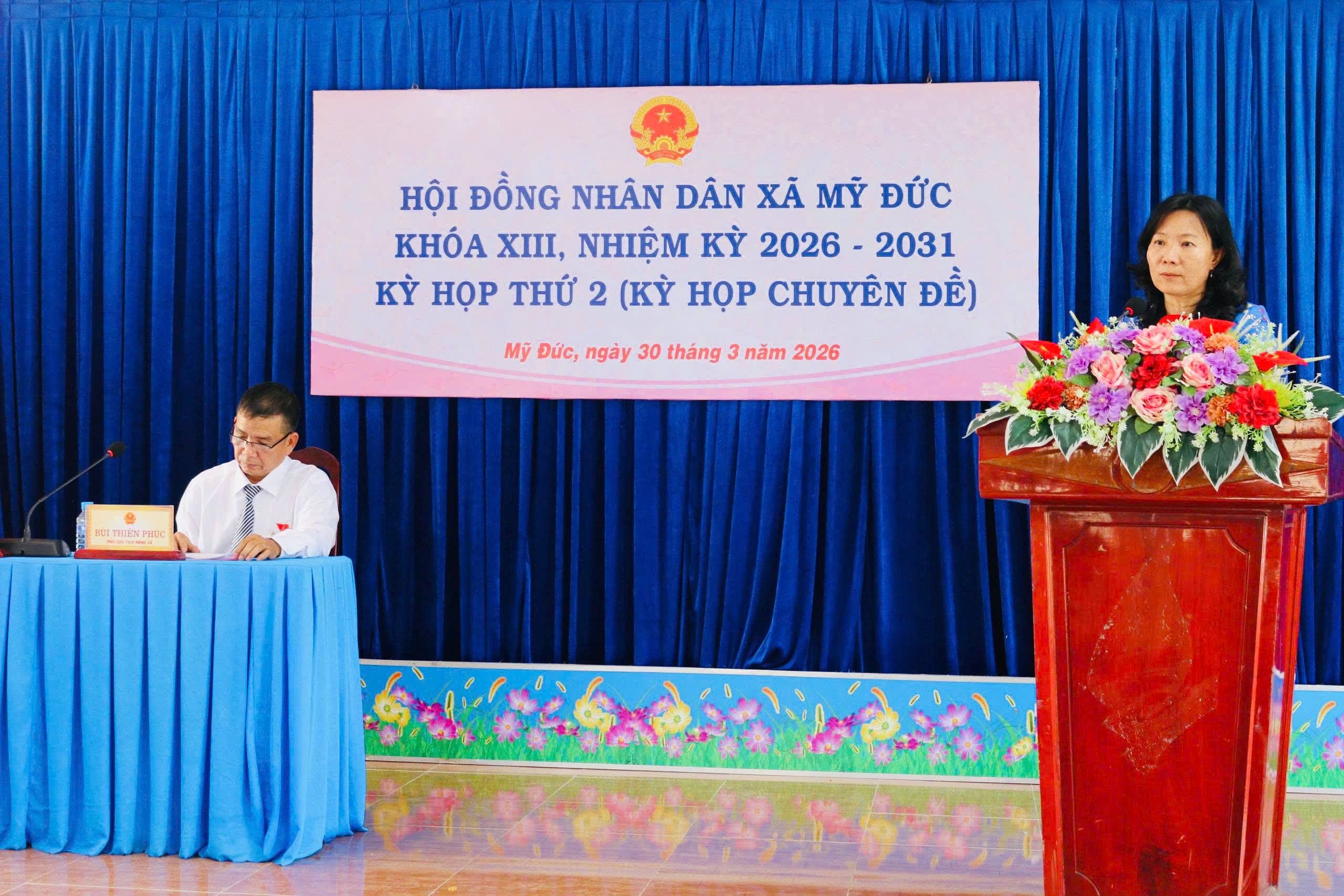 Ngày 30/3/2026, Thường trực Hội đồng nhân dân xã Mỹ Đức tổ chức Kỳ họp thứ 2 (kỳ họp chuyên đề) Hội đồng nhân dân xã khóa XIII, nhiệm kỳ 2026 - 2031 nhằm xem xét, phê chuẩn quyết toán thu ngân sách nhà nước trên địa bàn và quyết toán thu, chi ngân sách địa phương năm 2025 và các nội dung quan trọng thuộc thẩm quyền. Kỳ họp do bà Huỳnh Thị Hằng – Bí thư Đảng ủy, Chủ tịch Hội đồng nhân dân xã và ông Bùi Thiện Phúc – Phó Chủ tịch Hội đồng nhân dân xã đồng chủ tọa.